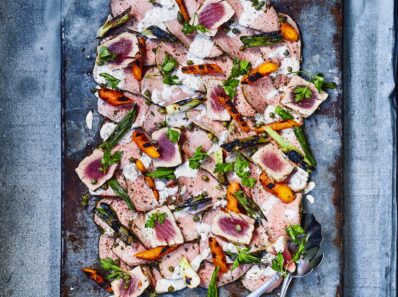 “De smokey-versie van de klassieke vitello tonnato krijgt door het roken van het kalfsvlees en het grillen van de tonijn een mooi bbq-accent, maar blijft fris en licht. Kun jer …