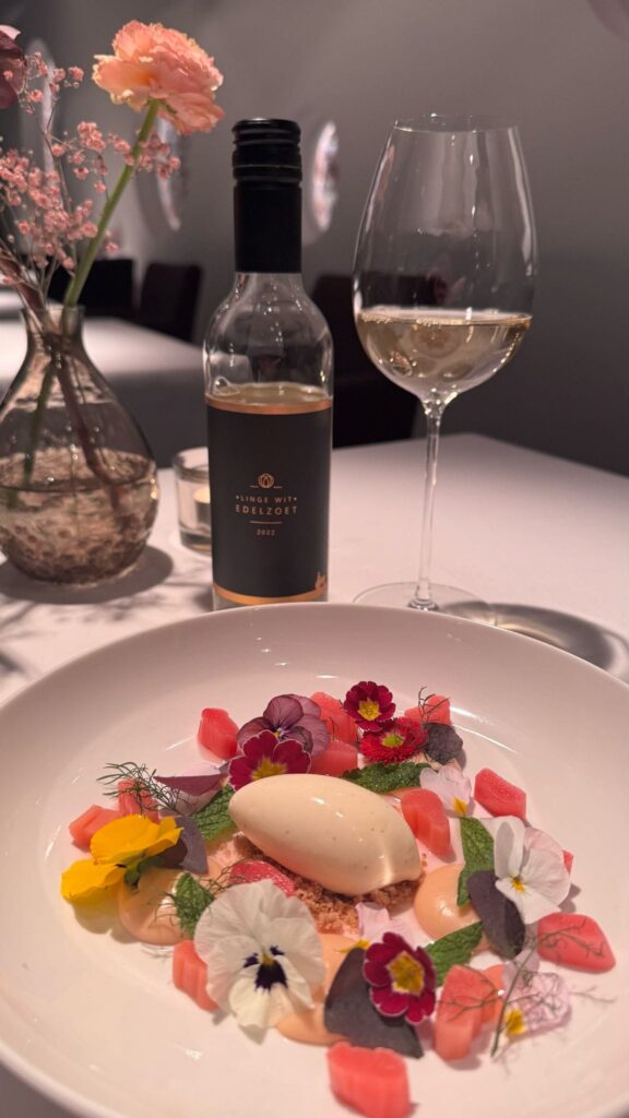 Bij het huidige menu is dat het dessert van gegaarde rabarber met een crémeux van rabarber en steranijs, vanille ijs, limoen crumble. De gel van rabarber en een reductie van rabarber en citroenmelisse omlijsten dit topdessert. Hoe lekker! En daarbij schenkt sommelier Bodhi Titselaar de LingeWit Edelzoet 2022 van Betuws Wijndomein. Deze dessertwijn, gemaakt van Solaris, Muscaris en Souvignier Gris, won in 2023 een gouden medaille bij de Wijnkeuring van de Lage Landen.